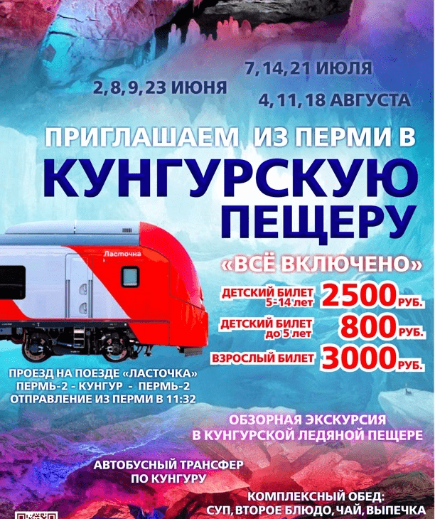 Приглашаем Вас в поездку по железной дороге на электропоезде «Ласточка» из Перми в «Кунгурскую ледяную пещеру» по маршруту Пермь-2 – Кунгур - Пермь-2».